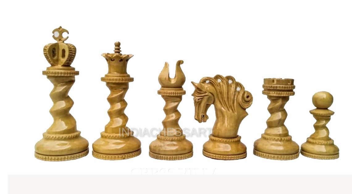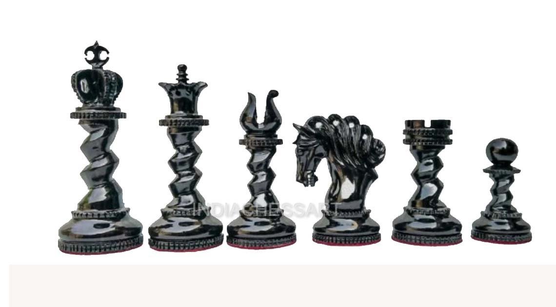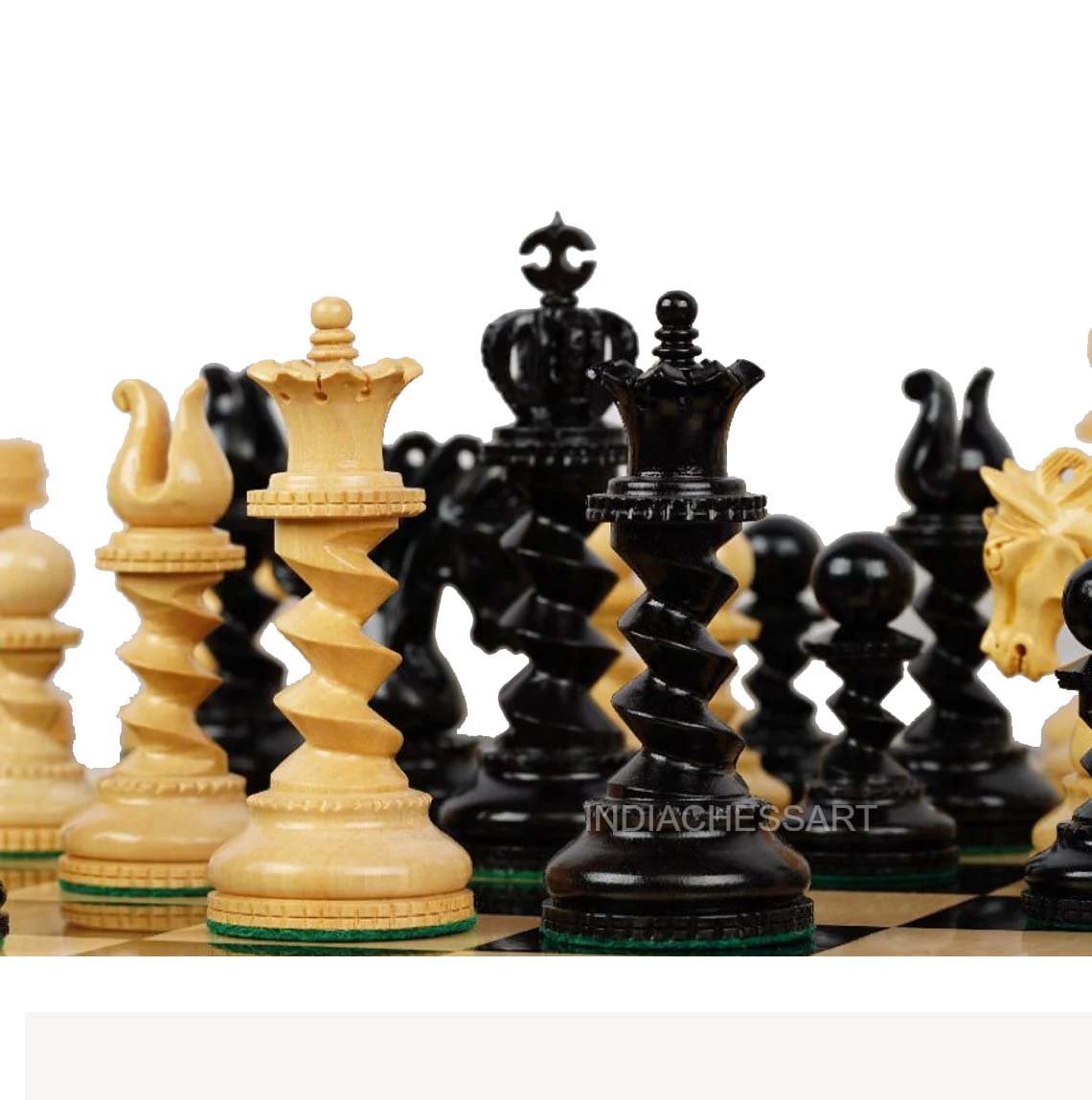 INDIACHESSART is proud to offer – The Signature Series- Twisted Luxury Series Chessmen. The Chessmen feature a 4.5″King with a 1.9″ Diameter base and are heavily weighted. These chessmen are finely crafted by our craftsmen who have inherited this skill for so many years. From the perfect on the King to the minute details of the knight’s mane, these EBONY Wood and Boxwood pieces have green felt on the bottom. The timeless beauty and the utility of this tournament series pattern chessmen has made it the set of choice for players and a highly prized design for collectors.